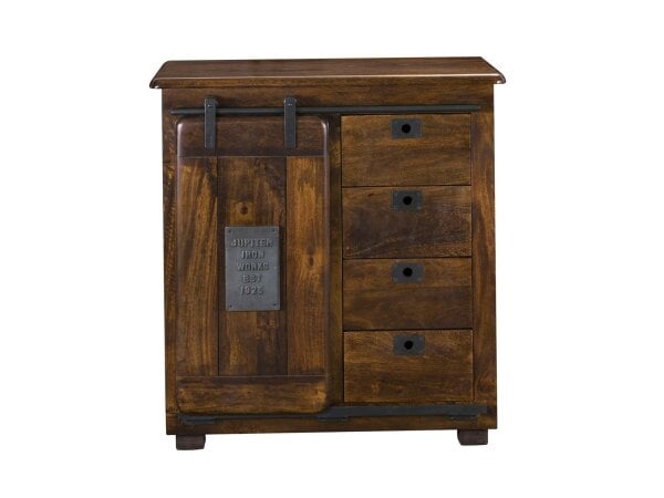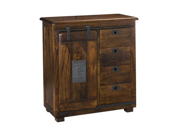 This cabinet has an interesting and unique design. The Warm Brown Mango finish is neutral toned and rich. A sliding