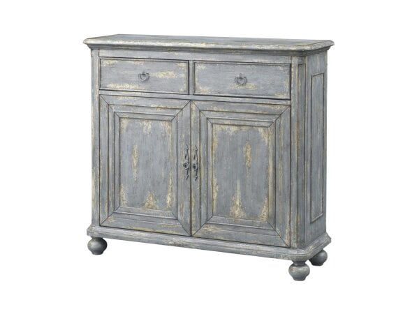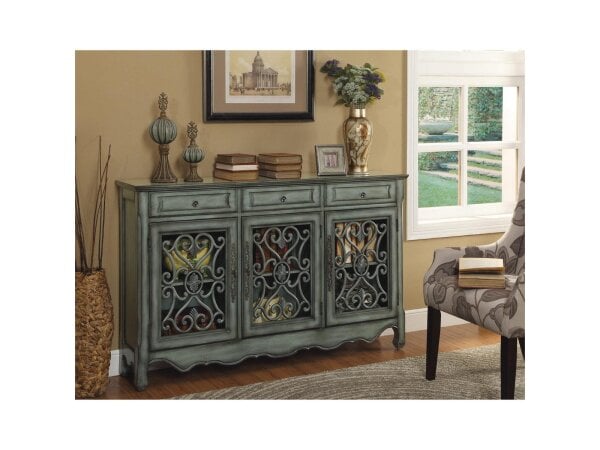 European flair and rustic accents make this three drawer credenza one of a kind. Finished in a neutral Hood Green