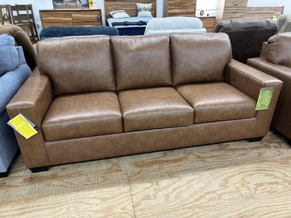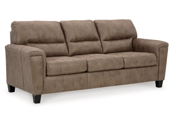 If you love the cool look of leather but long for the warm feel of fabric, you can take comfort in this queen sofa sleeper. Wrapped in a fabulous faux leather with a weathered hue and hint of pebbly texture to resemble the real deal, this decidedly modern sofa proves less is more. Elements include angled side profiling and track armrests wrapped with a layer of pillowy softness for that little something extra. Prominent jumbo stitching and clean-lined divided back styling lend fashion-forward flair. Rest assured, the queen memory foam mattress comfortably accommodates overnight guests.